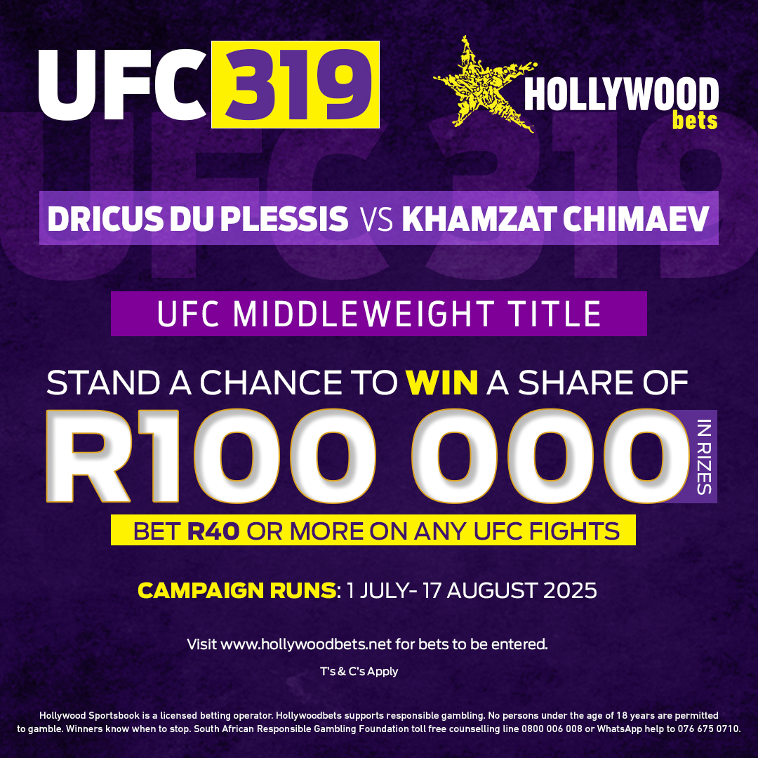Feel the adrenaline and bet R40 or more on any UFC fight at www.hollywoodbets.net between 1 July and 17 August 2025 and stand a chance to win a share of R100 000 in prizes. Ts & Cs apply.